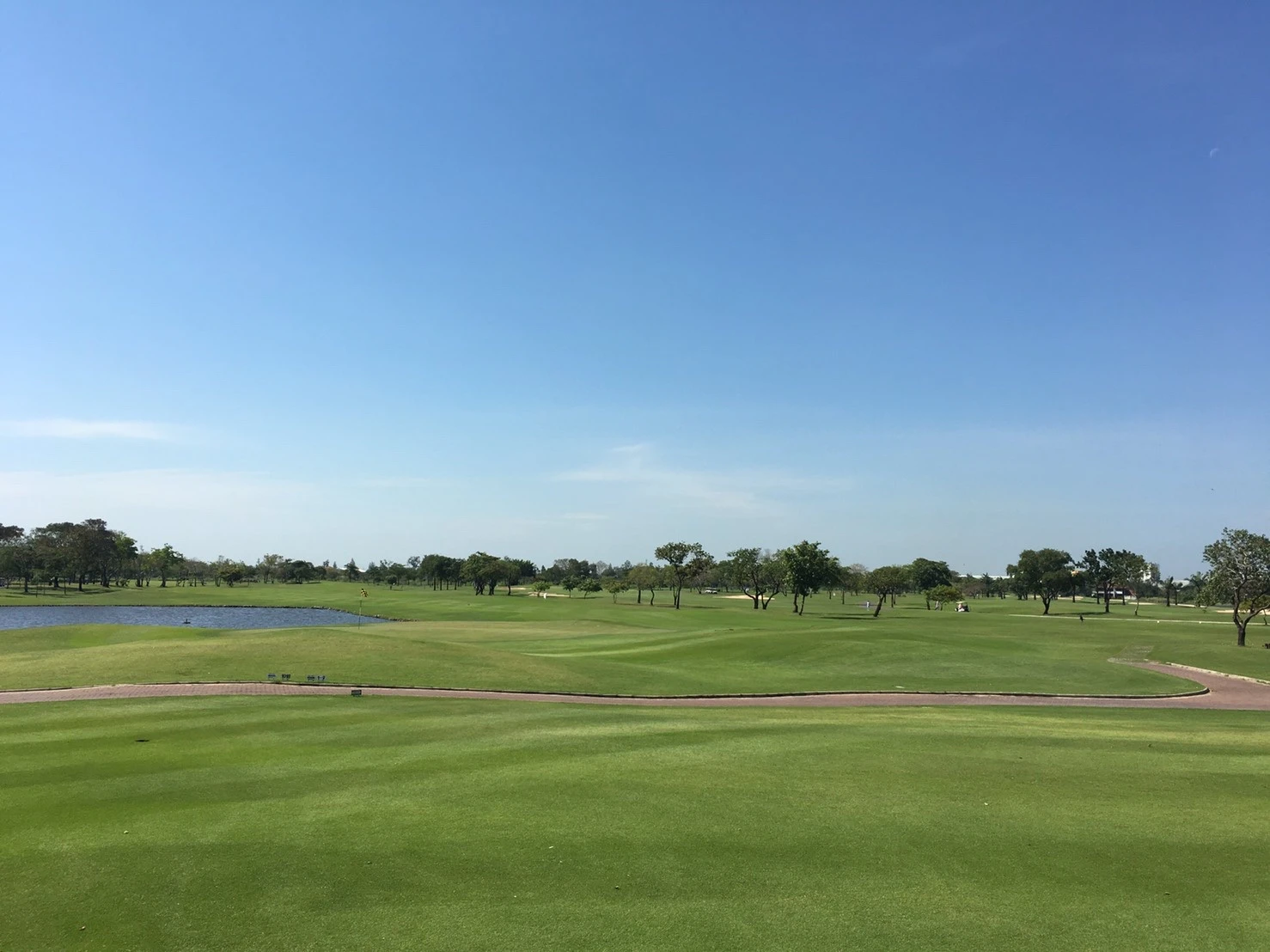 バンプーゴルフ&スポーツのコースは全体的に平坦ですが、巧みに配置されたウォーターハザードやバンカーが戦略的なプレイを求める作りになっています。特に11番ホールは、グリーン手前に大きな池があり、攻めるか守るかの選択が重要です。