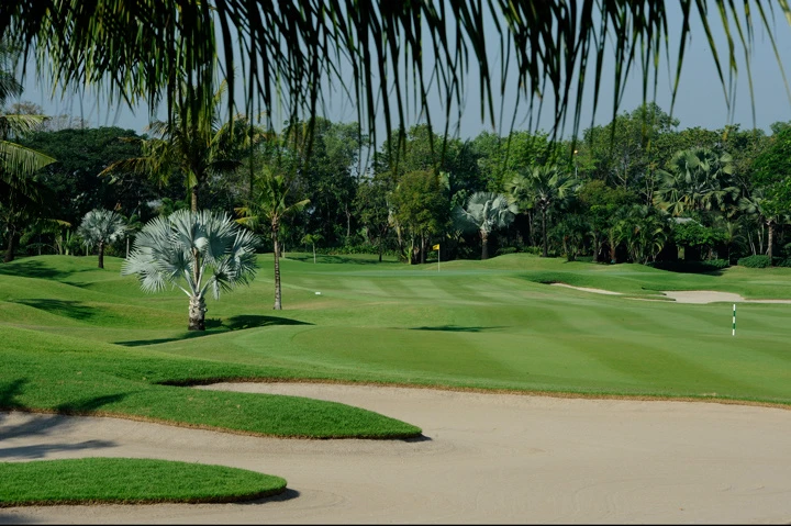 タイカントリークラブは、1996年にオープンしたタイの名門ゴルフ場で、バンコク都内から東に約1時間の場所に位置しています。スワンナプーム空港からだと約45分ほど。名門というだけあって過去に様々な有名トーナメントを開催してきており、特にタイガーウッズが海外初優勝した1997年のホンダクラシックで一躍有名になりました。現在もその記念として、クラブハウスのロッカーナンバー1にはタイガーウッズの名前が刻まれています。 タイカントリークラブは、世界的に有名なゴルフコース設計家のデニス・グリフィスによってデザインされています。一見平坦に見えるフェアウェイには実はなだらかなアンジュレーションがあったり、隠れた場所にウォーターハザード置かれていたりと、コースのレイアウトも非常に面白いです。ヤシの木に囲まれたコースは、いかにも南国タイっぽい雰囲気が漂い、良い思い出になること間違いないし。 タイカントリークラブは、コースだけでなくクラブハウスでも名門の雰囲気を感じられます。シャワーの他にジャグジーも完備しており、豪華なレストランではタイ料理や西洋料理の他に和食や中華料理も楽しめます。また、キャディやスタッフの教育もしっかりと行き届いていますし、練習施設もパッティンググリーンやアプローチ練習場からドライビングレンジまでしっかりとそろっており、何から何まで満足できるゴルフ場です。